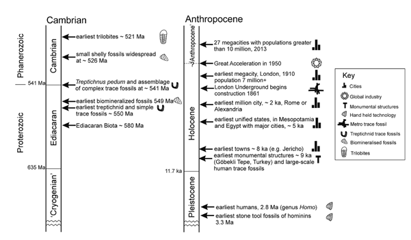 Untuk saat ini, Antroposen mungkin ditempatkan pada skala waktu yang lain, meskipun kita memahami bahwa Skala Waktu Geologis selalu bersifat hierarkis yang tersusun dari unit skala waktu terkecil yang lalu dikelompokkan secara bersamaan menjadi unit yang terbesar lihat Figure 1. Unit geokronologi terbesar adalah eons dengan eonothems sebagai pasangan kronostratigrafi materialnya. Saat ini kita hidup di Eon Fanerozoikum (~ 541 juta tahun lamanya) yang awalnya terkait dengan kemunculan diversitas organisme metazoa. Eon dibagi lagi menjadi era sehingga eonothems menjadi erathems. Era Kenozoikum adalah era yang bermula ketika meteorit besar mengakhiri dunia Mesozoikum di mana dinosaurus non-unggas di daratan dan ammonit di lautan sekitar 66 juta tahun lalu mengalami kepunahan. Setalah itu, lebih kecil lagi kita hidup di periode Kuarter di mana interval waktu sistem Bumi yang lebih dinamis dari fase glasial (Epos Pleistosen) menuju ke Epos Holosen. Seri Holosen tidak banyak tolak oleh ahli geologi karena bukti-buktinya sebagian besar dapat ditemukan di sedimentasi bebatuan, delta, dan es yang mengendap dan dapat dibedakan selama proses interglasial yang terbentuk. Alhasil, catatan Holosen lebih kaya secara arkeologis dan geologis. .