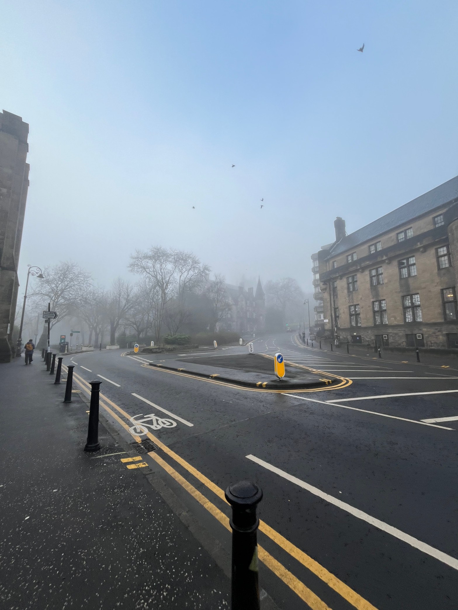 Di minggu kedua, aku memiliki jadwal terakhir untuk bertemu dengan pembimbing kedua, Eyang Philo. Kami memilih kafetaria kampus sebagai tempat pertemuan untuk menutup tahun sebelum liburan musim dingin. Jika sebelumnya aku datang terlalu awal, kali ini aku datang terlambat lima menit dari waktu yang sudah disepakati. Aku berjalan cepat dari kos menuju kampus. Terlebih lagi, kampus Glasgow itu seperti perbukitan kecil, tidak terlalu tinggi tetapi cukup melelahkan jika harus berlarian kecil untuk naik ke atasnya. Saat itu, udara begitu dingin dan hanya kabut tebal yang menyelimuti kampus. Aku berasa hidup di dunia fiksi Silent Hill.